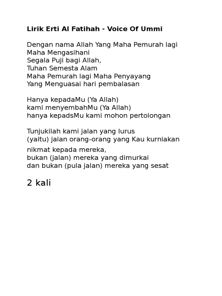 Dengan nama Allah Yang Maha Pemurah lagi Maha Mengasihani Segala Puji bagi Allah Tuhan Semesta Alam Maha Pemurah lagi Maha Penyayang Yang Menguasai hari pembalasan Hanya kepadaMu Ya Allah kami menyembahMu Ya Allah hanya kepadsMu kami mohon pertolongan Tunjukilah kami jalan yang lurus yaitu jalan orang-orang yang Kau. Segala puji bagi Allah yang menjadikan kita semua Alhamdulillah Segala puji bagi Allah yang menciptakan alam semesta Alhamdulillah Maha Suci-Mu ya Allah yang mencurahkan limpah kurnia Subhanallah Maha Suci-Mu ya Allah terima taubat insan berdosa Subhanallah Pada Tuhan kita doakan Diselamatkan dijauhkan dari Neraka Mudah-mudahan dengan rahmat-Nya. Musik-musik dari Raihan diterima baik oleh masyarakat Indonesia.